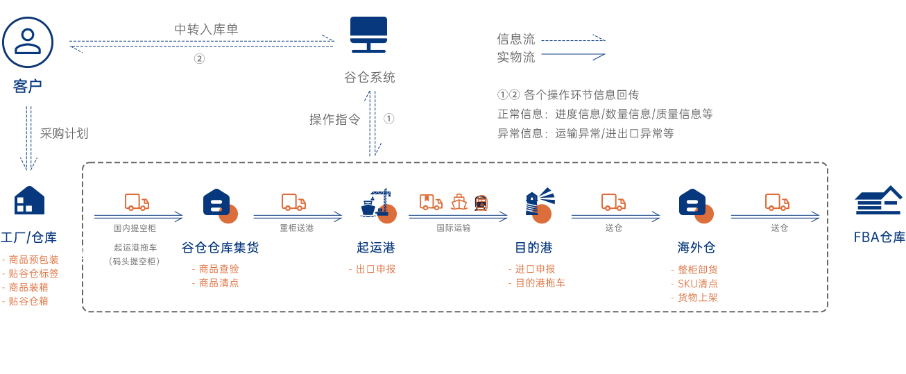 為客戶提供從國內攬收整柜/集拼、起運、進出口清關到谷倉海外倉入庫、中轉送FBA倉一站式服務。
